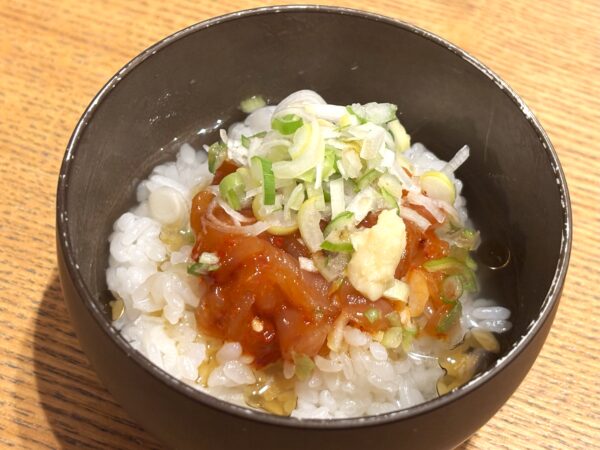 炊いたごはんに、ほたてひもチャンジャをのせて、みじん切りしたネギをかけ、しょうがチューブを入れます。